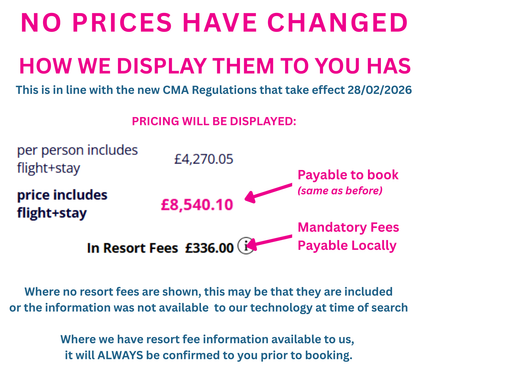 The price you pay to book has not changed, but we do have to highlight any local mandatory taxes that are payable by you directly to the resort.